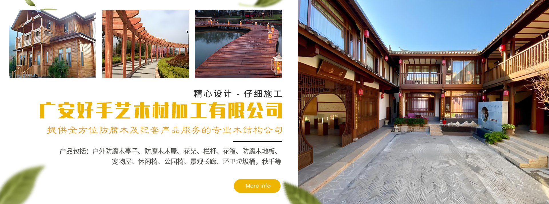 廣安好手藝木材加工有限公司專業(yè)從事防腐木木材的生產(chǎn)及銷售,企業(yè)立足防腐木材生產(chǎn)、銷售、設(shè)計(jì)、咨詢?yōu)橐惑w的綜合性企業(yè),產(chǎn)品包括:戶外防腐木亭子、防腐木木屋、花架、欄桿、花箱、防腐木地板、寵物屋、休閑椅、公園椅、景觀長廊、環(huán)衛(wèi)垃圾桶,秋千等公共配套設(shè)施的生產(chǎn)、銷售、安裝。
